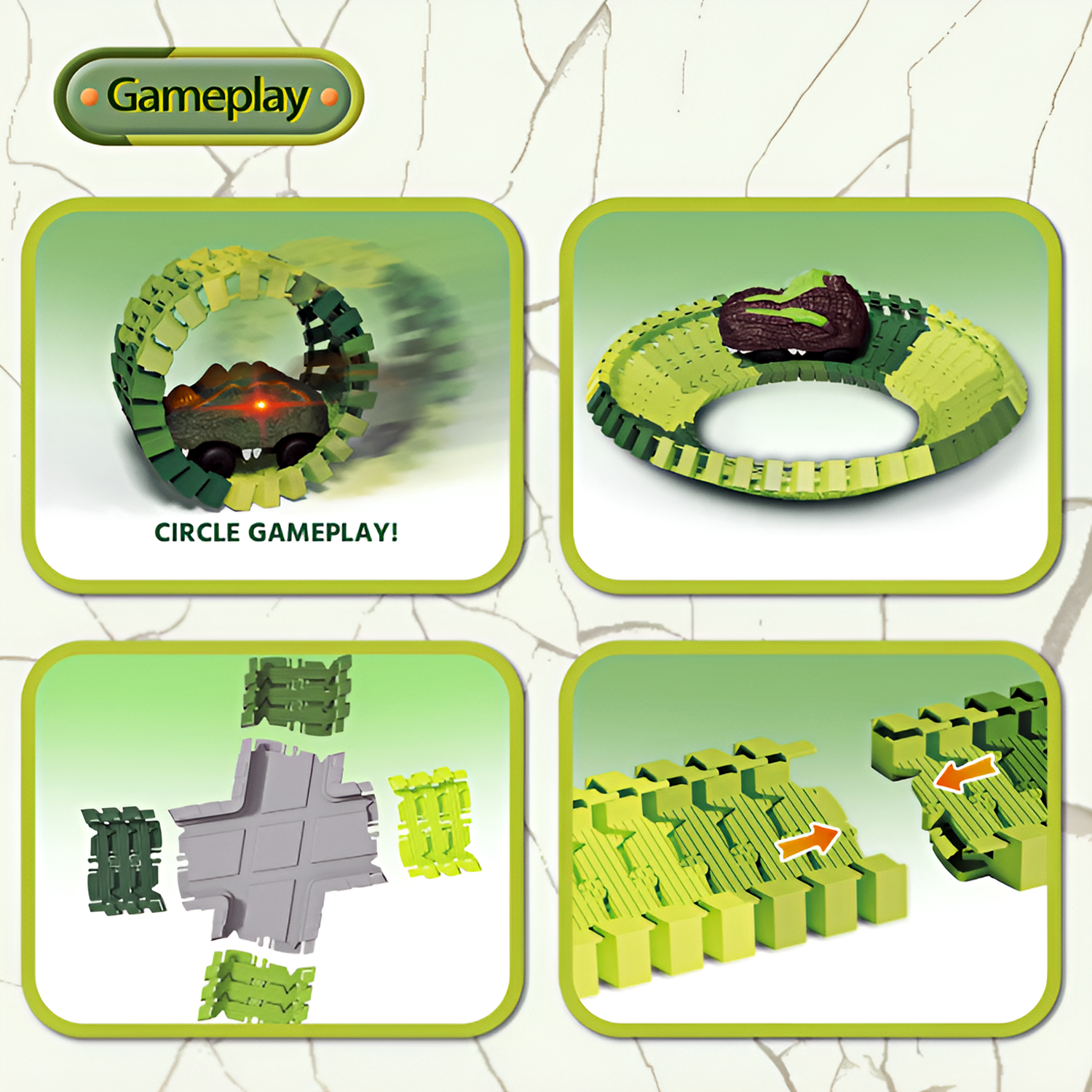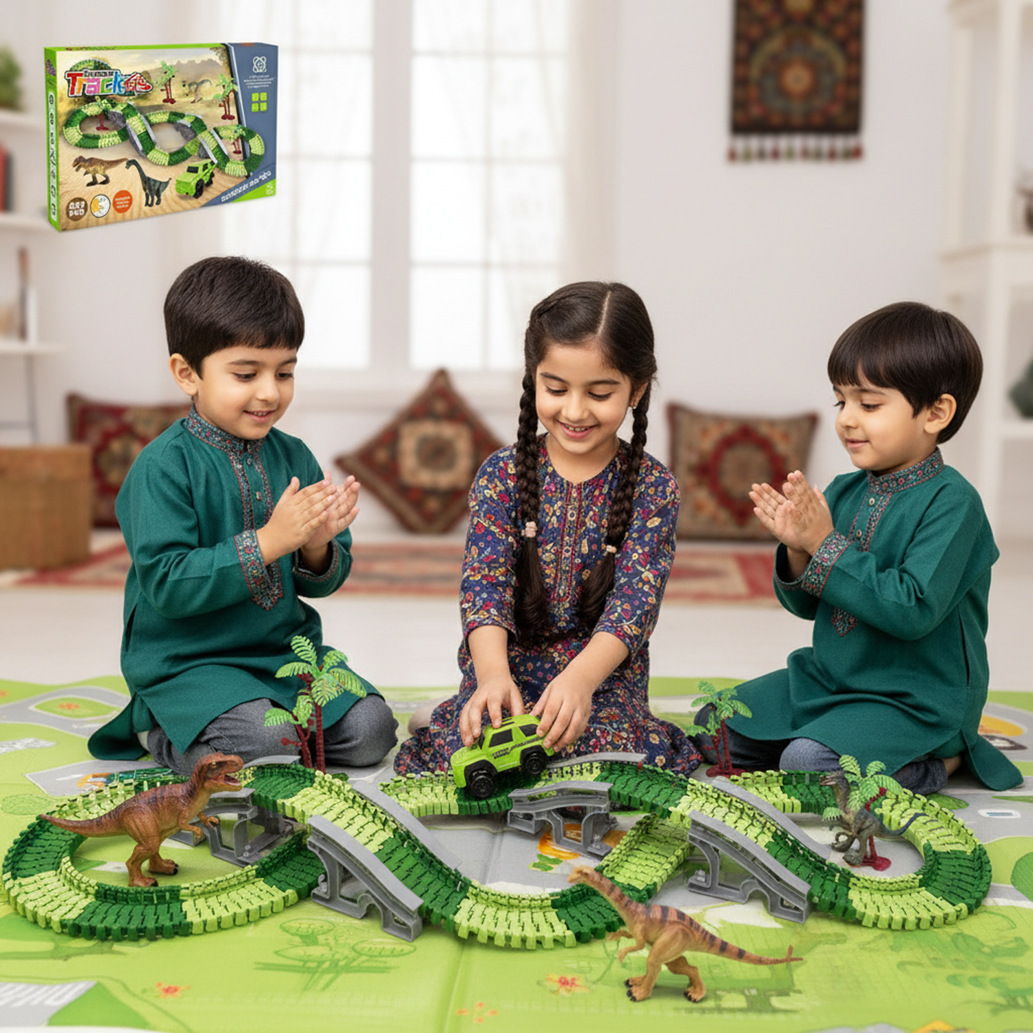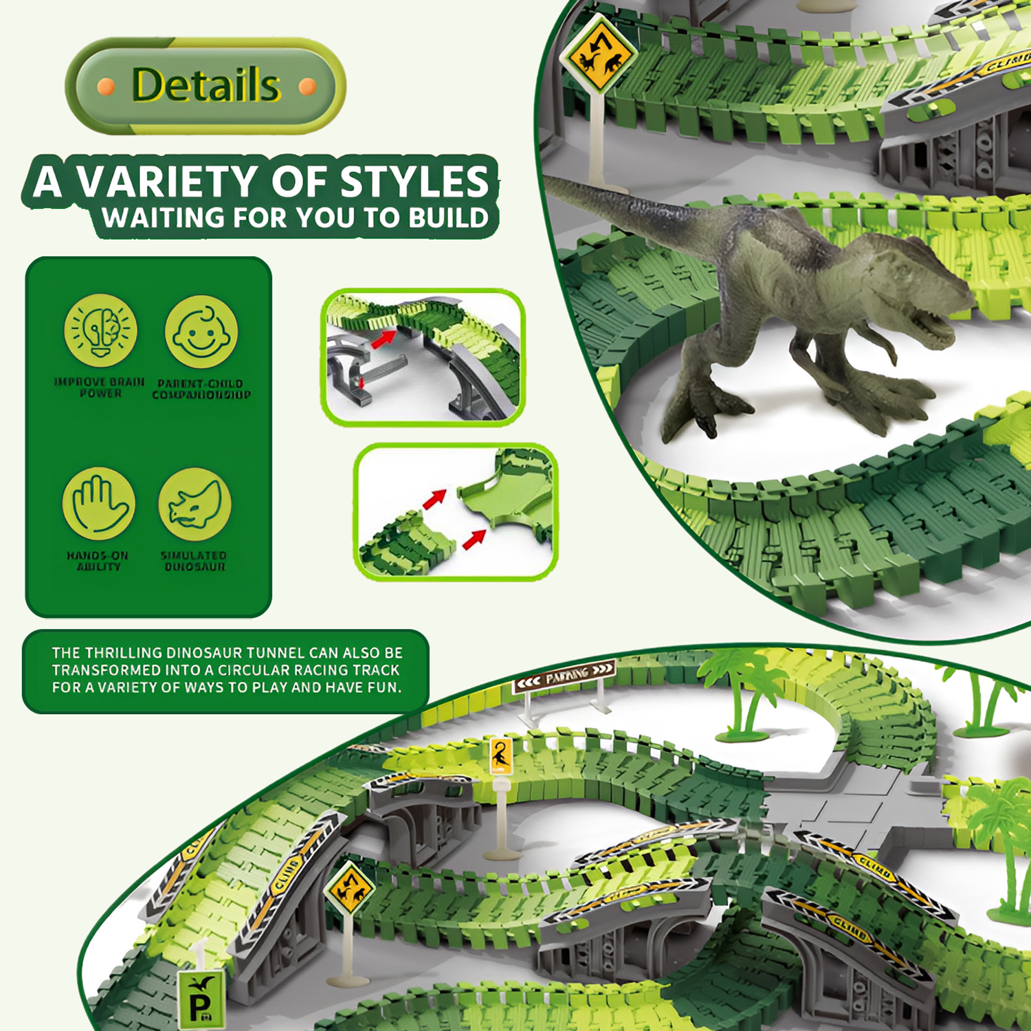 Take a prehistoric journey back in time with the Dinosaur Track Playset! This massive 205 piece construction kit allows children to build their own sprawling Jurassic world, complete with winding roads, elevated bridges, and dangerous predators.